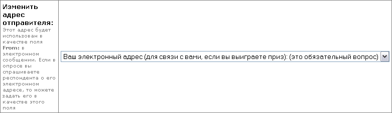 Пример: ![]() Ваш электронный адресВведите адрес (адреса), на который вы будете получать уведомления. Настройка уведомлений![]() Использовать как имя отправителяЗдесь вы можете выбрать, какой из вопросов анкеты будет использован в качестве имени отправителя в письмах, которые вы будете получать. Например, если один из вопросов анкеты спрашивает об имени респондента, укажите его здесь, и уведомления будут помечены реальными именами респондентов. Пример: ![]() Использовать как адрес отправителяЗдесь вы можете выбрать, какой адрес будет указан в качестве адреса отправителя в уведомлениях. Если вы в анкете просите указать адрес, используйте это поле здесь, и письма будут приходить с реальных адресов ваших респондентов. Пример: ![]() Использовать как тему письмаВыберите, какой из вопросов анкеты будет использован в качестве темы письма с уведомлением. Пример: Нажмите кнопку Сохранить , чтобы сохранить изменения и вернуться на страницу Мои анкеты. Кнопка Отменить отменяет сделанные изменения и возвращает вас на страницу Мои анкеты. Назад || Содержание|| Дальше |